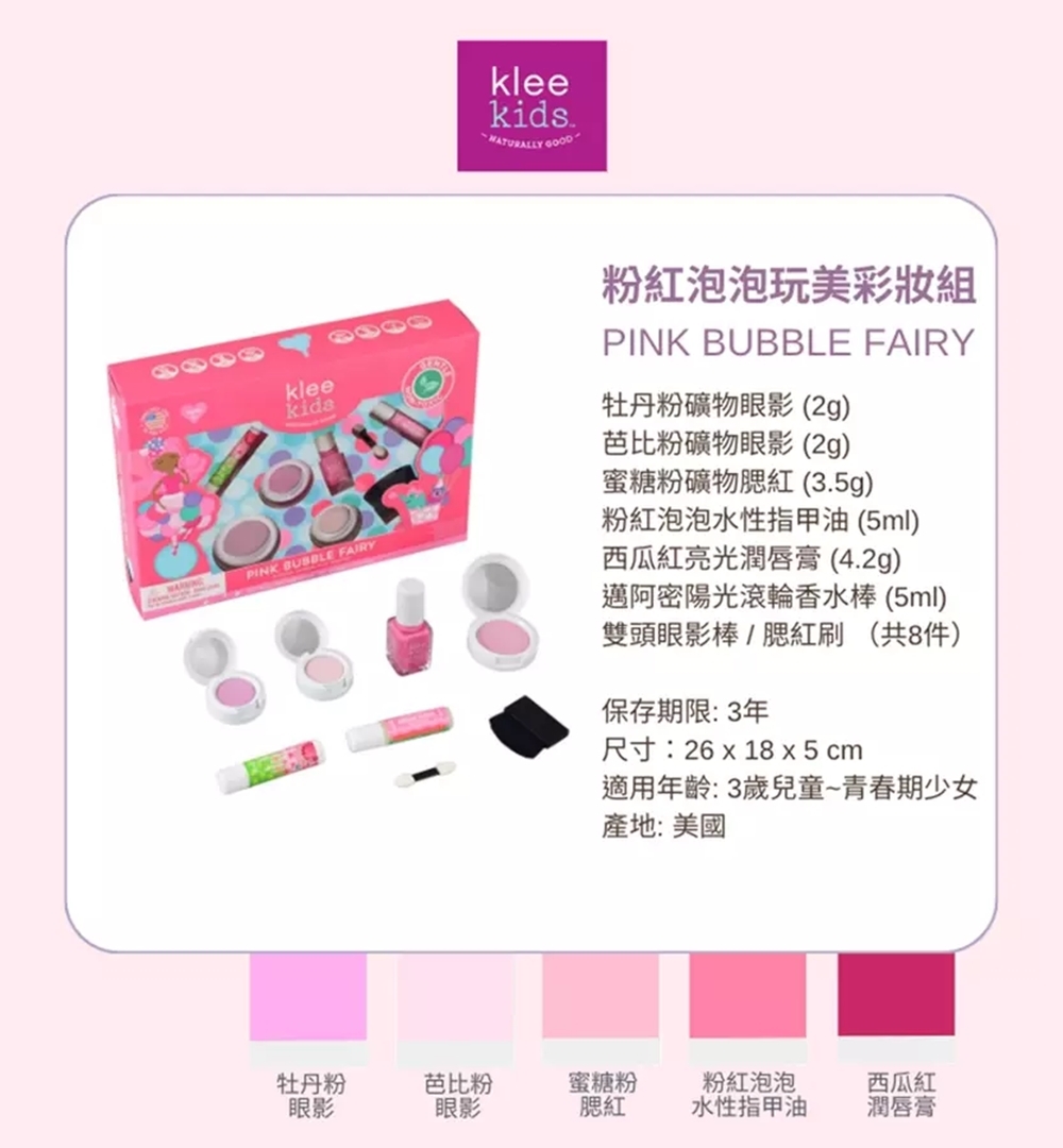 這款彩妝組包含8件商品,所有都是專為3歲以上兒童設計的礦物彩妝,不會刺激小朋友嬌嫩的肌膚,只需用溫水和肥皂就可以輕鬆清潔乾淨。水性質地的指甲油不含甲醛,無難聞的臭味,浸泡溫水3分鐘後即可輕易剝除。滾輪式的香水棒採用天然花露水與草本精油結合,擦在肌膚上不易引起敏感,輕輕推開後,散發著淡雅的香氣,深受寶貝們喜愛。全產品美國製造,我們致力於降低寶貝們被化學物質刺激的任何可能性!讓寶貝在玩美時光中享受安全、無憂的彩妝體驗。玩美妝不僅能讓他們在妝容上做變化,也間接培養了創造力和自信心。讓寶貝在安心的彩妝世界中展現自己的個性!