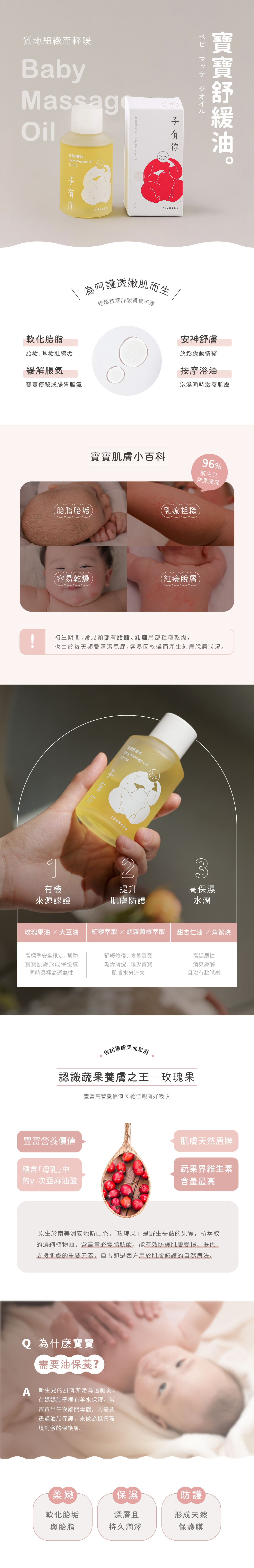 質地細緻輕暖 / 輕柔按摩緩解脹氣 / 有機來源認證 / 全天然植物來源油脂 / 高保濕水潤 / 軟化胎脂 / 新生兒適用