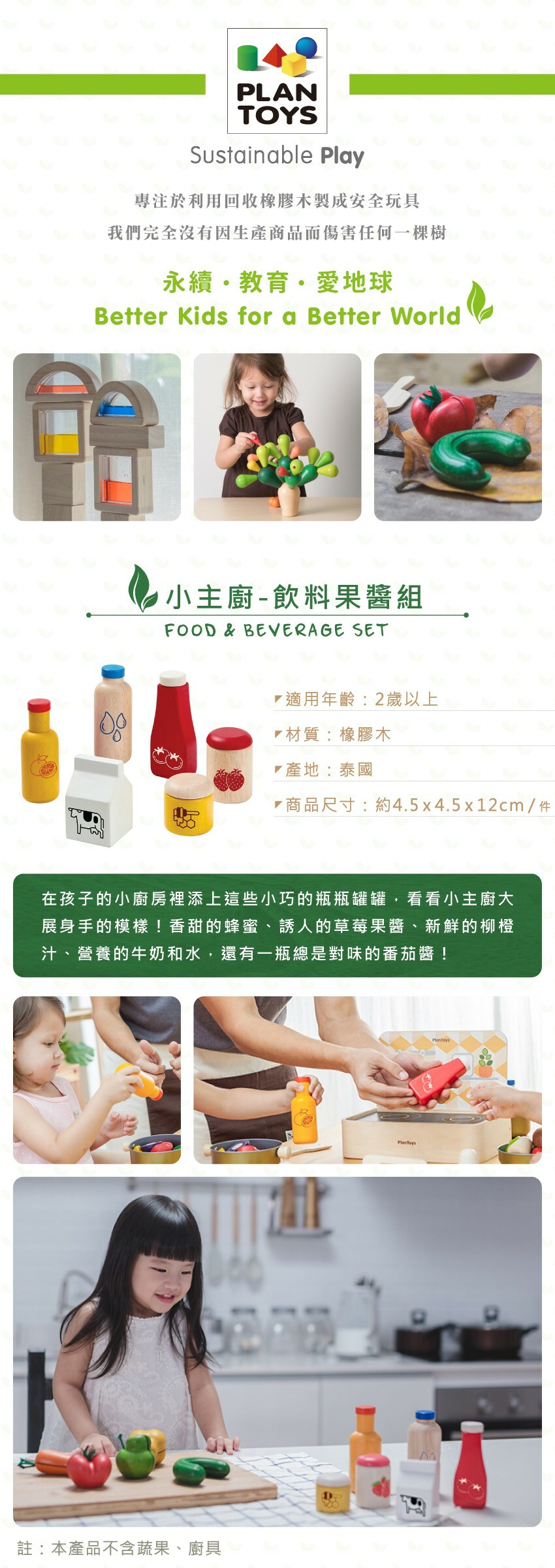 商品簡介 : 在孩子的小廚房裡添上這些小巧的瓶瓶罐罐,看看小主廚大顯身手的模樣!香甜的蜂蜜、誘人的草莓果醬、新鮮的柳橙汁、營養的牛奶和水,還有一瓶總是對味的番茄醬!