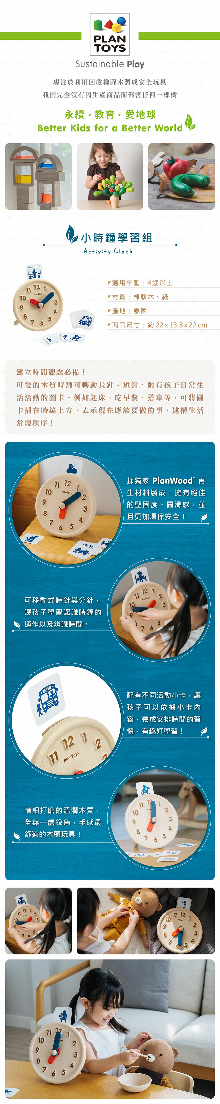 商品簡介 : 建立時間觀念必備!可愛的木質時鐘可轉動長針、短針,附有孩子日常生活活動的圖卡,例如起床、吃早餐、搭車等,可將圖案插在時鐘上方,表示現在應該要做的事,建構生活常規秩序。