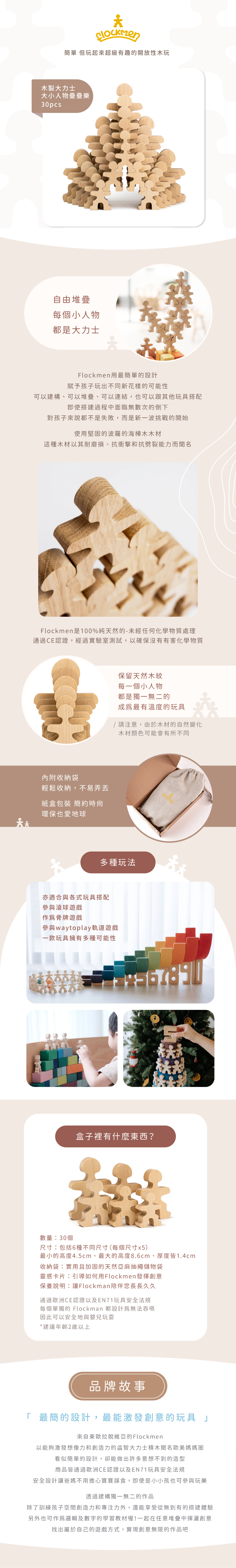 來自東歐拉脫維亞的flockmen,以能夠激發想像力和創造力的益智大力士積木聞名歐美媽媽圈。看似簡單的設計,卻能做出許多意想不到的造型。商品皆通過歐洲CE認證以及EN71玩具安全法規,安全設計讓爸媽不用擔心寶寶誤食,即使是小小孩也可參與玩樂。