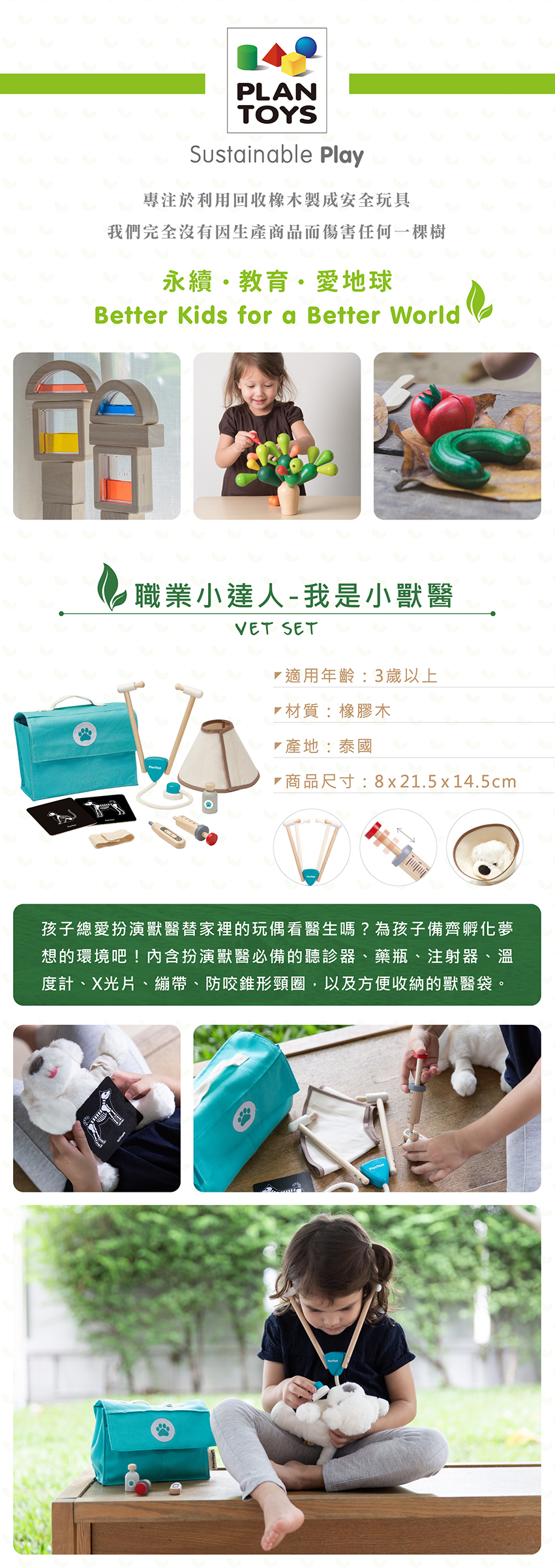 商品簡介 : 孩子總愛扮演獸醫替家裡的玩偶看醫生嗎?為孩子備齊孵化夢想的環境吧!內含扮演獸醫必備的聽診器、藥瓶、注射器、溫度計、X光片、繃帶、防咬錐形頸圈,以及方便收納的獸醫袋。